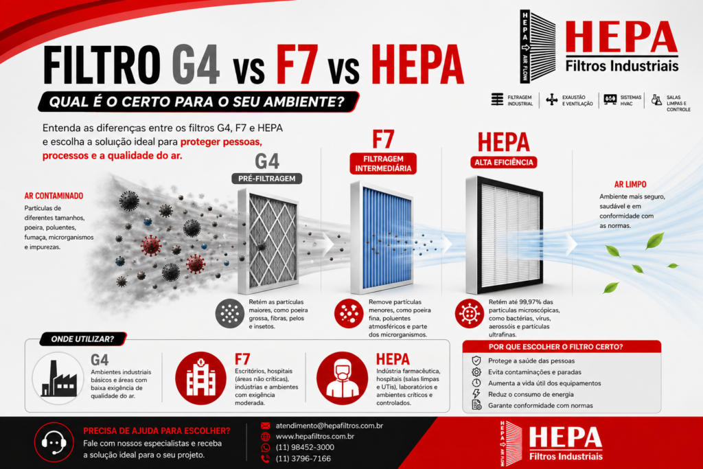 Por isso, entender as diferenças entre os filtros G4, F7 e HEPA é essencial para tomar a decisão correta.